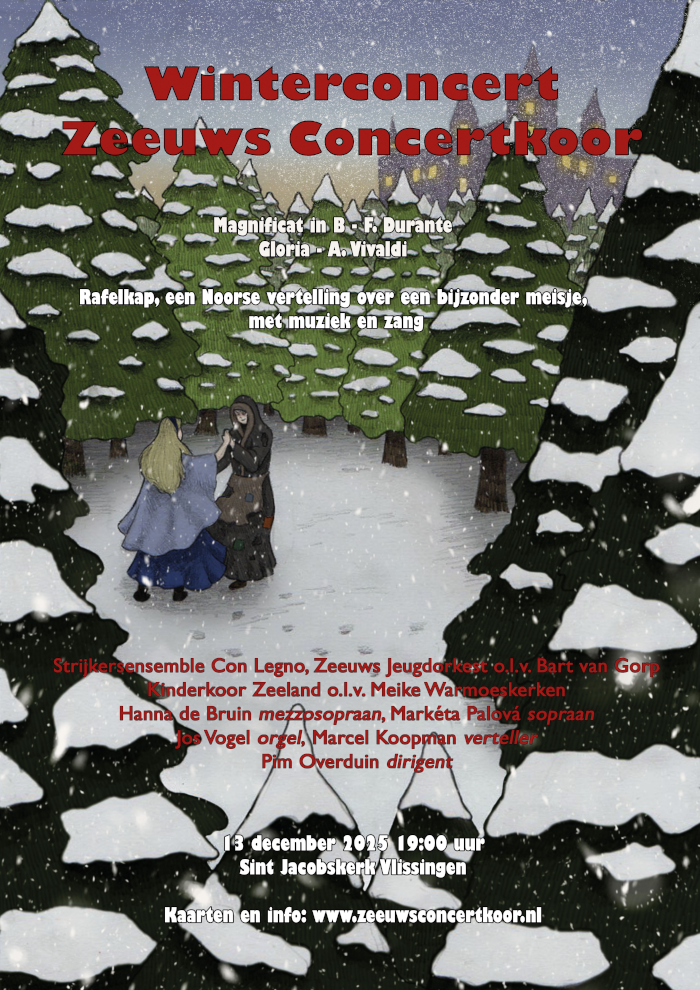 Op 13 december 2025 geven wij ons winterconcert in de Sint Jacobskerk in Vlissingen. We beginnen met een Italiaans onderonsje tussen Durante en Vivaldi en na de pauze een Noorse vertelling over Rafelkap, een bijzonder meisje, afgewisseld met koorliederen en muziek van de Noorse componist Ole Olsen, gearrangeerd door Bart van Gorp. Heel bijzonder is dat het Kinderkoor Zeeland voor de eerste keer meedoet aan een concert van het Zeeuws Concertkoor. Het wordt een voorstelling voor jong en oud, een concert voor het hele gezin. De toegangsprijzen hebben wij dan ook laag gehouden, tot en met 11 jaar mag je gratis komen luisteren, voor jeugd van 12 tot en met 17 jaar kost een kaartje € 10,00 en voor overigen € 20,00. De aanvang van het concert is 19.00 uur.